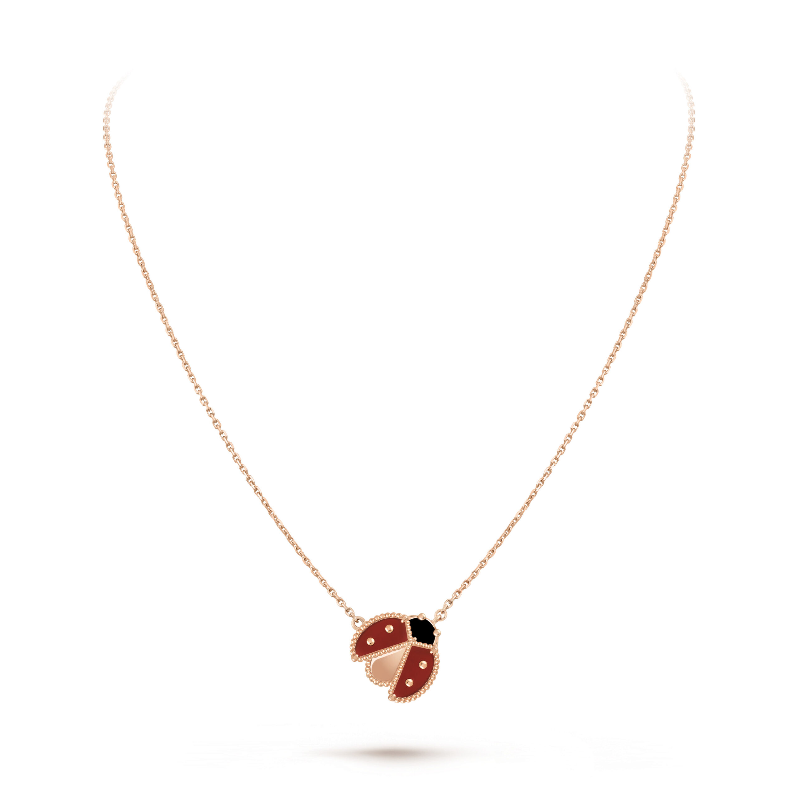 2025 bereichern vier neue Kreationen die poetische Welt der Maison. Blütenknospen von Maiglöckchen und Marienkäfer erstrahlen in den schimmernden Farben von Roségold, weißem Perlmutt, Onyx und Karneol als Anhänger, Zwischen-Finger-Ringe und Armband.